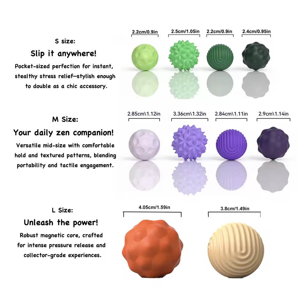 - Bolas de imán de rodillo de silicona: Las bolas de imán de rodillo de silicona ofrecen una experiencia sensorial satisfactoria con cuatro texturas distintas.